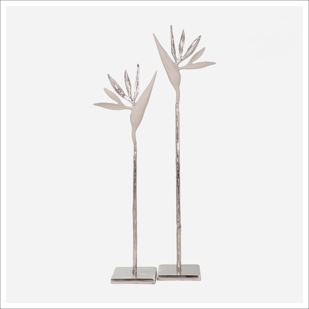 The Conlan Sculpture Set features two elegant bird of paradise flower sculptures crafted from aluminum with a sophisticated silver finish. Each piece captures the graceful, architectural form of the Strelitzia flower, known for its distinctive crown-like blooms and dramatic silhouette. The larger sculpture stands at an impressive 29.5 inches high with a 7-inch length and 5-inch width, while its companion piece measures 25 inches high with a 6.5-inch length and 5-inch width. The pair creates a striking dimensional display with their clean lines and contemporary metallic aesthetic. These botanical-inspired pieces can serve as stunning focal points on console tables, mantelpieces, or display pedestals, either grouped together or positioned separately for visual balance. The sculptures' slender profiles and modern interpretation of natural forms make them versatile additions to both minimalist and luxe interior spaces, adding height and artistic presence to any room.