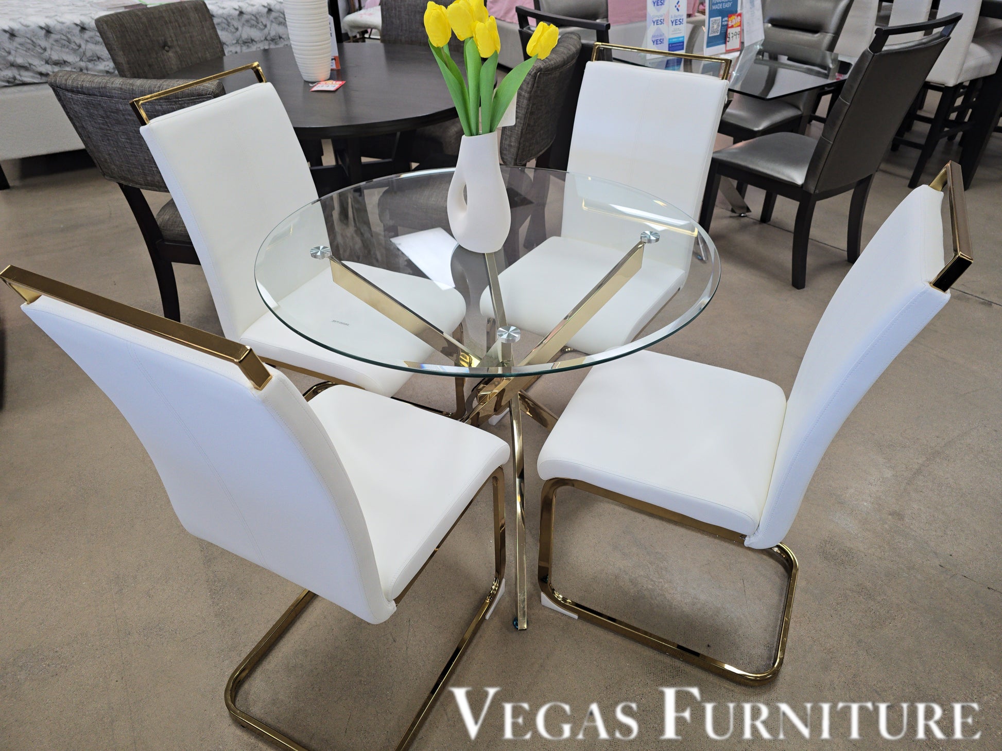 Upgrade your dining experience with our 5-piece dining table set. Crafted with high quality, durable tempered glass, this modern gold design will add a touch of elegance to any dining room. Enjoy a stylish and sturdy dining experience every time.