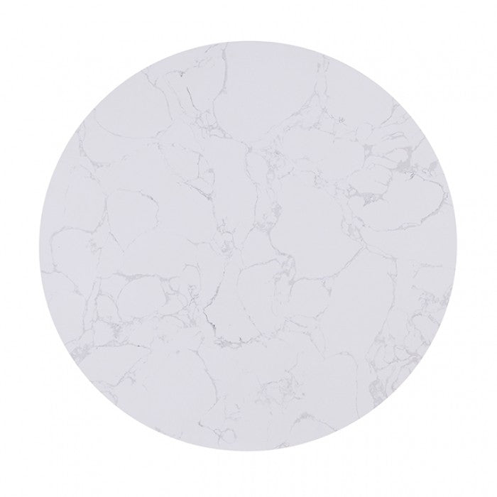 Table + Chairs ContemporaryNatural/Black/White Engineered Stone, Fabric, Metal, WoodEngineered Stone Table TopPolywood Drum BaseCurved Arm & Backrestw/ Gold Accent on Chairs