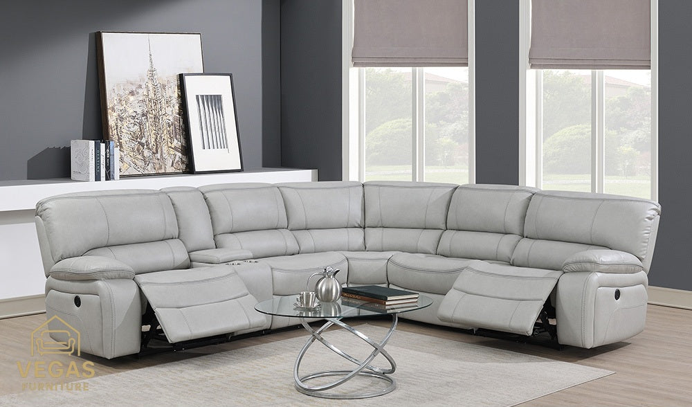 This sleek and modern sectional features water-resistant fabric and a stainless steel cupholder on the console. Each switch includes a USB 2 port for added convenience. Relax in style with power reclining capabilities. Perfect for any living space.