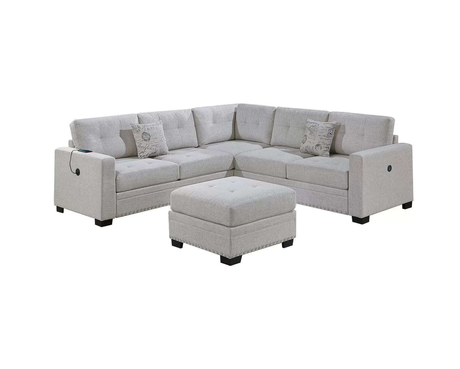 Transform your living space with this inviting sectional set, designed to bring comfort and style together in one seamless package. Featuring an L-shaped configuration, this set includes a right-arm and left-arm one-arm loveseat, a corner wedge, and a matching cocktail ottoman. The sectional’s clean lines and square arms give it a modern yet welcoming look that fits perfectly in a variety of room styles. The seating area is crafted with burlap-like fabric that adds a natural, textured feel, complemented by a unique mail head trim detail around the base of the ottoman